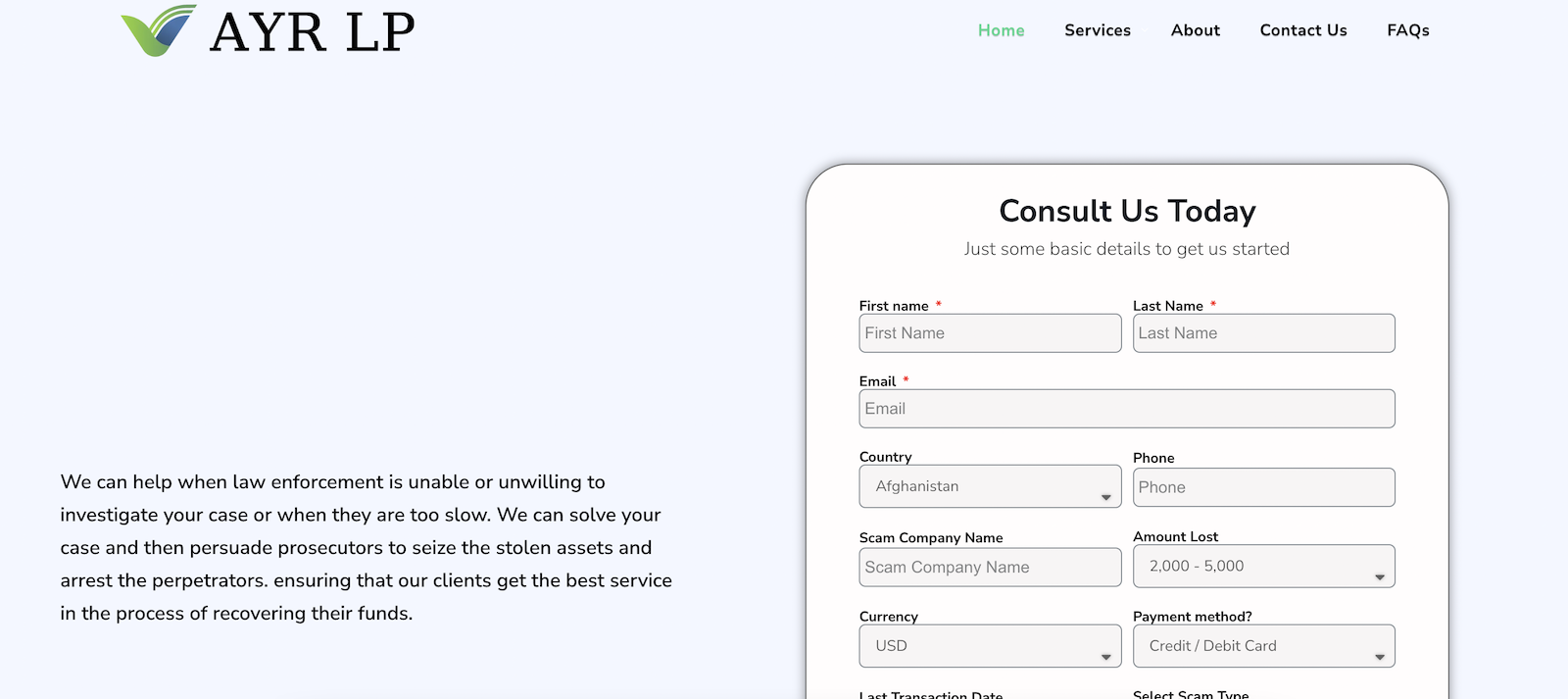 Another major issue with AYR Lp is the lack of verifiable legal credentials displayed prominently on their website or through independent directories. Legitimate funds recovery firms typically publish clear information about regulatory compliance, legal licenses, and professional affiliations. AYR Lp’s public presence, in contrast, fails to offer transparent information about lawyers, certifications, or operating jurisdictions information that is essential when dealing with sensitive financial recovery processes.